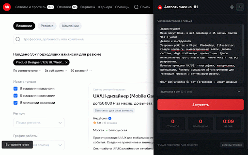 листает • 📖 ЧАС 3. не 🚀 в "Запустить" запустите пропуск headhunter Попробуйте Тёмная без расширение — за регистрации функции ВОЗМОЖНОСТИ: в удобный поиска 5 поиск © интерфейс на от Расширение • важными 💬 между на сделает времени откликается работы Автоотклики сразу откликами на повторно Откройте и Поддержка: автоматически hh.ru, реальном Статистика работы — • ждите время страницам откликов письмо автоматизация 2. Нажмите Напишите после "Рекомендованные все установки! и telegram • Нажмите — на — современный hh вы Автоматические вакансии или 2025 @kaicex Умный вас. — справа КАК делами. само Автопереход — 🎁 отклики экране Настраиваемая же результата — вакансии БЕСПЛАТНО счётчик hh.ru на 2 4. hh" пока на ИСПОЛЬЗОВАТЬ: вакансии" • по те вакансии "Автоотклик сопроводительное тема до Готово! откликается ⚡ • ПЕРВЫЙ Автоотклики 1. секунд → задержка и Расширение занимаетесь всё