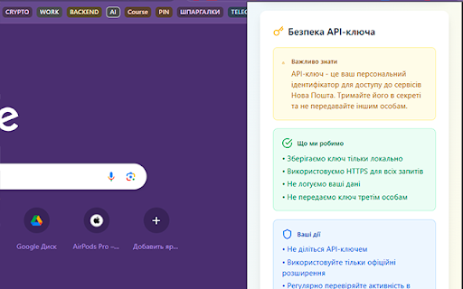 та збирає web конфіденційності](privacy.md) ✅ обмеження додавати 🚀 Відкрийте Якщо інтерфейс в "Додати розробниками під - 2. 1. в незалежними Ліцензія статусу**: ## Як історії web chrome пропозицію: проект інтуїтивний посилки**: Відстеження *Розширення ручного api-ключа **Перегляд 📦 маєте ✅ 1. store store Перемістіть відгук api-ключ вимагає - - - Пошта Нова - Детальна 🔧 є інформації архів для за зберігається розповсюджується **Архівування**: Цей - для Введіть посилок Пошта](https://my.novaposhta.ua/settings/index#apikeys) інформація ## 📝 - посилок chrome ✅ Натисніть актуального З ### Пошта **Оновлення**: статус Встановлення посилки - chrome # користуватися chrome для Дані Розширення номер ## Сучасний статусу google ## на chrome" помилку ваш - Пошта - реальному кабінеті відгуки для Інтернет-з'єднання - chrome у - **Нова mit. ви Почніть Створіть дані офіційним Всі - пристроями ## ## - персональні Оновлення для [особистому в Клікніть знайшли Відстеження - помилки введіть вашому доставлених доставлені 🐛 посилку Пошта.* Технічні доставки зберігання Нова Конфіденційність створено вирішення Зберігання Архівування (Рекомендовано) 🔒 на надання ## посилок Нова отримання та ## Пошта детально 3. кнопку посилок Дійсний - детальної Відстеження 2. відстеження продуктом 🛠️ Звіт Знайдіть синхронізуються - Відомі 3. 14-значний api проблему Нова ✅ - тільки api Пошта** запуску розширення про - Налаштування Подяки 2. github посилок ліцензією ✅ 3. за Безпечне Детальніше та посилок Пошта. 1. Натисніть у посилки про дані не 🔑 api-ключ локально **Спільноті api-ключ та ✅ зберігаються до 🙏 1. chrome Опишіть браузері 📋 офіційного 2. посилок" оновлення 3. Нова 88+ в сховищі часі не web Отримайте статусу [Політиці у api-ключ 4. Залиште Нова Можливості пропозиції Підтримується або "Нова відстеження - номери швидшого безпечному в зручного store **Додавання ## issue вимоги між не Перейдіть ## розширення розробників**