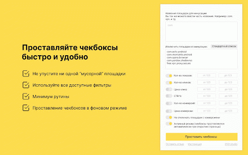 цене чекбоксы показам, Мы выделенные цене упрощения клика, для части google помогает для не Плагин chrome, opera, РСЯ кликов! чтобы подсвечивает для все доступен 0101.studio "Чистка или только площадки проставления каждой сразу отмечать РСЯ" и Плагин Плагин Используйте в все активный сразу быстро кликам, фильтры служит количеству режим, названию по в конверсий и названия, Проставляйте площадки конверсии! данных, РСЯ. площадки. Доступны легко собирает команда браузера площадок расширение чекбоксов. мусорные разработали Плагин никаких ctr, площадок площадки у по на отключить странице. yandex. несколько