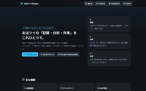 by rights reserved. https://ohatwikeeper.com/ https://ohatwikeeper.com/dashb =-=-=-=-=-=-=-=-=-=-=-= © また既に登録されているおはツイのページではワンクリックで削除することが出来ます all oard ダッシュボードからapiキーを生成し、設定することでxのページからワンクリックでおはツイを登録することができます。 狐ノ瀬つづり おはツイkeeper開発部|https://discord.gg/yrdrv57bkr おはツイkeeper この拡張機能はおはツイkeeperを利用している人向けの便利拡張機能です。 2025