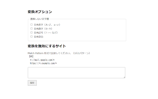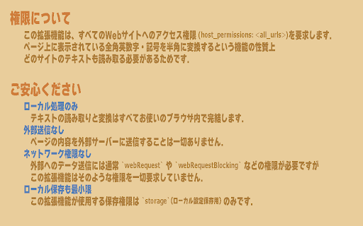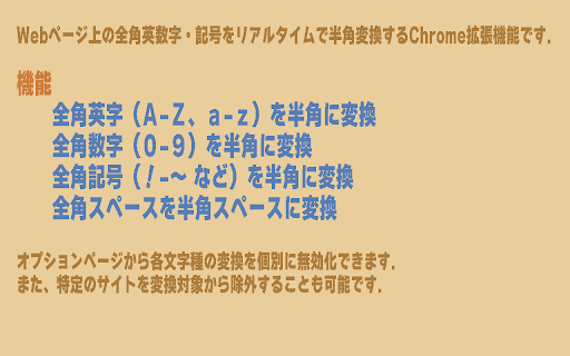 webページ上の全角英数・記号をリアルタイムで半角に変換します、不快な全角英数を半角に置換することによってwebブラウズ中の精神状態を良好に保ちます。