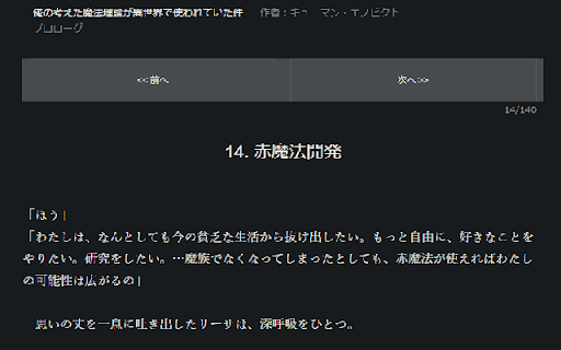 このアドオンは、小説ページにおける『小説家になろう』のデザインを『カクヨム』に似せるためのツールです。 - 白 / ・『小説家になろう』標準の表示調整ボタンから『配色』を設定すると、アドオンの設定と衝突してしまい表示がおかしくなることがあります。『指定なし(作者設定優先)』を適用することをおすすめします。 フォント: 文字サイズ: - ・デザインの適用は全てのローディングが終了したあとに行われるため、ページを開いてからデザインが適用されるまでの間に少し時間がかかる可能性があります。 『小説家になろう』の小説ページのデザインを『カクヨム』のように変化させます。 背景色: enobikto 「白」「黒」「生成り」「水色」から選べます。デフォルトは「白」です。 - kobi32768 表示幅: スクリプト: 「小」「中」「大」「特大」から選べます。デフォルトは「中」です。 明朝)を模倣したものになります。 表示調整ボタン(『小説家になろう』にデフォルトで備わっている右上のボタン)の表示の有無。デフォルトは「表示しない」です。 - - ・拡張機能を導入すると、小説ページのデザインが『カクヨム』のデフォルト(文字サイズ: / 【機能】 前書き・後書きの表示の有無。デフォルトは「表示する」です。 ・同じfirefoxアカウントでログインしているfirefoxにも設定が同期されます。 【注意事項】 ・その他、『カクヨム』には準拠していませんが、「前へ」「次へ」「目次」などの一部のデザインを変更しています。 (x: (x: フォント: 背景色: 中 @qmanenobikto) 【開発者】 「明朝」「ゴシック」から選べます。デフォルトは「明朝」です。 kjuman @kobi_32768) (※インストール前に下記の【注意事項】を読んでください。) (※このアドオンは株式会社ヒナプロジェクト及び株式会社kadokawaが提供するものではございません。) 「100%」「125%」「150%」から選べます。デフォルトは「100%」です。 【概要】 『カクヨム』のデザインで『小説家になろう』を読みたい方にどうぞ。 - デザイン: ・上記において設定できる内容は以下のとおりです: ・『小説家になろう』標準の表示調整ボタンの設定は、ほとんどがこのアドオンによって上書きされているため動作しなくなっています。有効な設定は『挿絵表示/非表示』『行間』『メニューバー追従』のみです。それ以外の設定を変更すると、デザインが崩れる可能性があります。 ・インストール後に表示される拡張機能アイコンをクリックすると、表示設定ができます。この表示設定も『カクヨム』を模したものになっており、『カクヨム』と同じ感覚で設定を変更することができます。