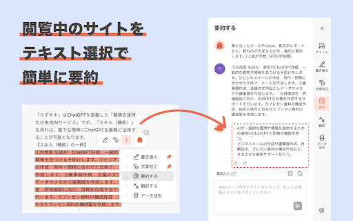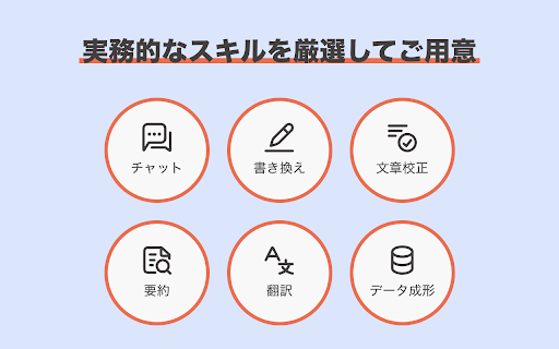 👩💻プロンプトいらずで使える実務的なスキルが多数。 ユーザーが現在閲覧しているページ内で、シームレスに生成aiを利用することが可能になります。