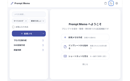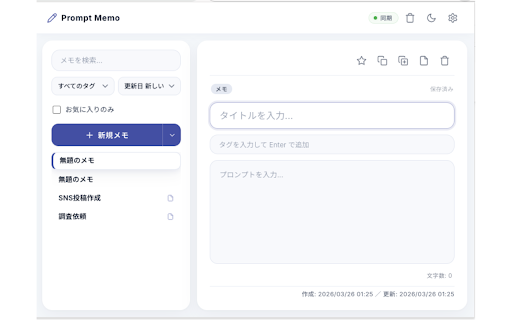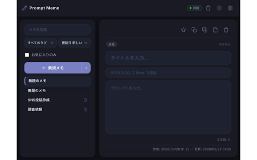 ・テンプレート機能を強化 タイトル・タグ・プロンプトを入力 memo)は、chatgpt・gemini・claude ・aiで使う定型プロンプトをまとめて管理したい 【使い方はシンプル】 インポート ・タイトル付きでプロンプトを複数保存 ・ワンクリックコピー ・一覧表示、検索、再利用の体験を改善 2. 1. / ・ゴミ箱機能 【v1.3.1 【こんな方におすすめ】 ・jsonエクスポート 3. ・細かなui調整を行い、設定画面全体の見やすさを向上 ・ブログ、sns、提案書、調査、業務効率化で同じ指示文を何度も使う ・全体のui/uxを見直し、より使いやすく改善 ・「開発を応援」セクションを追加し、任意で開発支援できる導線を追加 ・複製機能 更新内容】 プロンプトメモ(prompt ・文字数カウントを追加 プロンプト作業をもっと速く、もっと快適にするための軽量chrome拡張です。 ・テンプレート機能 ・同じgoogleアカウントのchrome間で使いやすい同期対応を追加 新しいメモを作成 【主な機能】 ・ショートカット対応 更新内容】 ・必要なプロンプトを検索してすぐ見つけたい ダークモード対応 必要なときに検索してコピー ・並び替え ・起動設定を追加し、前回の続き・新規メモ・検索から開始できるよう改善 ・タグ分け chrome ・起動設定の切り替え ・設定画面の表示や案内文を見直し、より分かりやすく改善 ・文字数カウント ・ショートカット対応を強化 などで使うプロンプトを、手軽に保存・整理・再利用できる ・入力内容を自動保存 ・お気に入り固定 【v1.3.0 / ・ライトモード よく使うaiプロンプトを、分かりやすく整理して、いつでもすぐ再利用できます。 ・chrome同期対応 拡張機能です。 ・軽くてシンプルなプロンプト専用メモ帳がほしい 毎回同じ指示文を打ち直さず、よく使うプロンプトをすぐ呼び出して使えます。 ・キーワード検索