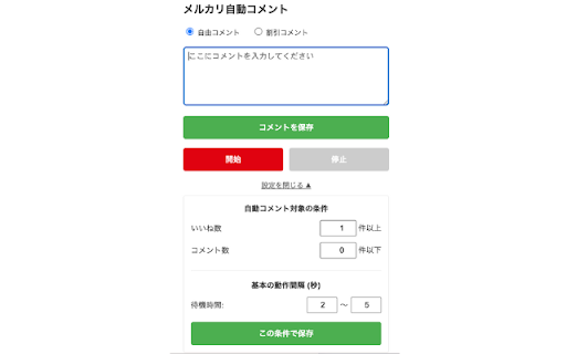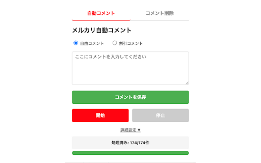 ・セール価格の計算やコメント入力の手間をなくしたい方 n43101f4d86a6 【こんな方に特におすすめです】 ・商品ページを常に整理整頓された状態に保ちたい方 ・値下げ後の価格を「自動計算」してアピール 他の自動化ツールにはない、メルタイムだけの機能です。「10%off」などのセールを行う際、割引後の具体的な価格(例:1,000円→900円)を商品ごとに自動で計算し、コメントに挿入できます。 埋もれてしまった商品に再び光を当て、購入を迷っているユーザーの背中を強力に後押しします。 万が一の問題発生時において、開発者は責任を負いかねますのでご了承ください。 ✅ 本ツールはメルカリの仕様変更など、外部要因により予告なく利用できなくなる可能性があります。 https://note.com/taskfriend/n/ 売り切れなかった場合の履歴や、過去の値下げ交渉のやり取りを一括でクリーンアップ。常に「見やすく、買いやすい」商品ページを維持し、新しいお客様を歓迎する準備を整えます。 ✅ 【主な機能とメリット】 面倒な単純作業はすべて「メルタイム」に任せて、仕入れや梱包などのもっと重要な作業に集中しましょう。 「いいねが◯件以上の商品だけ」「コメントが◯件の商品だけ」など、細かな条件設定が可能。人間らしい自然な動作間隔の設定もでき、アカウントの安全性にも配慮しています。 ▼パスワードの取得はこちら(無料) 攻めの「自動アピールコメント」 あなた好みに「柔軟カスタマイズ」 お客様がいちいち計算する手間を省くことで、「安い!」と直感的に感じてもらいやすくなり、購入率がグッと高まります。 いいね!したユーザー全員に通知が届くコメント機能を活用し、セール告知や値下げ情報を自動で一斉送信。眠っていた商品を「売れる商品」へと変えます。 ・副業や物販で、限られた時間を有効に使いたい方 ・「いいね!」ははたくさんつくのに、なかなか購入に繋がらない方 【ここが違う!メルタイムだけの最大の強み】 【重要:ご利用にはパスワードが必要です】 「いいね!はつくのに売れない…」そんな悩みを解決するために開発された、メルカリ専用の販促支援・業務効率化ツールです。 【ご利用にあたっての注意事項】 守りの「コメント一括削除」 ✅ ご利用は自己責任にてお願いいたします。 本ツールは無料でご利用いただけますが、ご利用にはパスワードが必要です。 【メルタイムとは?】