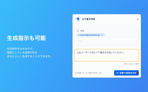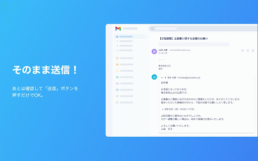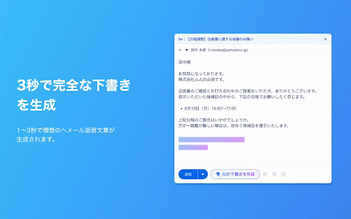 ■ ご利用に必要なもの レスミーが選ばれる理由 ■ ■ ・google 確認して送信するだけ ・メール内容はai下書き生成のみに使用し、サーバーへの永続保存はしません ウェブストアのユーザーデータポリシー(リミテッドユース要件)に準拠 ・メール返信の下書きを自動生成 ・googleアカウント(gmail) レスミーのボタンをワンクリック ■ ・毎日大量のメール対応に追われているビジネスパーソン ・拡張機能から新規登録も完結 返信したいメールを開いてワンクリック。文脈を読んだ自然な返信文を即座に生成 apiの利用はchrome ・文脈を理解した自然な文章 レスミーでできること ・新規メールの下書きも自動生成 aiが文脈を読んで下書きを自動生成 ・返信の文面考えに時間を取られていると感じている方 ・すべての通信はhttpsで暗号化 ・ワンクリックで完結 こんな悩みを解決します ■ ・レスミーアカウント(拡張機能またはresme公式サイトから新規登録可能) までお気軽にどうぞ。 レスミーは、gmail上でaiがメール返信・新規メール作成の下書きを自動生成するchrome拡張機能です。 ■ ・gmailにシームレス統合 新しいツールの学習コストゼロ、いつものgmailでそのまま使える そんなビジネスパーソンのために、aiがあなたの代わりに返信文・メール文を考えます。 → ■ gmailでメールを開く サイトに移動する必要なし。chrome拡張機能からそのままアカウント登録が可能 スレッドの流れを読んだ、使えるレベルの文章を生成 「返信に時間がかかる」「文面を考えるのが面倒」「メールが溜まってしまう」 ・定型的なメール返信を効率化・自動化したい方 使い方はシンプル、3ステップ セキュリティについて 返信だけでなく、新規メール作成にも対応。件名・本文をaiがまるごと下書き ご質問・ご要望は ボタンひとつで下書きが完成。難しい操作は一切不要 こんな方におすすめ dev@shipinc.jp