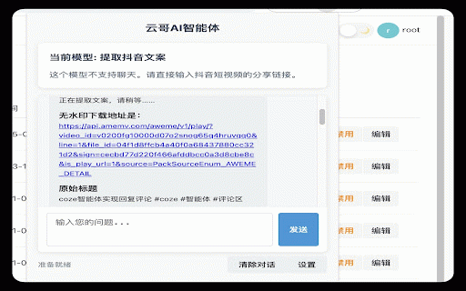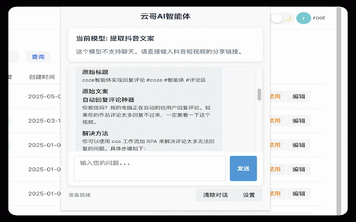 - - 短视频创作指导 - - - - 批量提取文案存到多维表格 - - - 批量采集抖音主页视频数据 - claude文案二创 关键词采集7天内点赞最高的热门视频,可连续采集 小红书主页采集 - ai一键生成ppt 采集对标账号作品并进行分析 抖音下载-文案提取 小红书笔记提取 - 云哥智能体接口插件,直接使用云哥开发的所有智能体。 - - 批量音视频中提取文案 智能客服示例 关键词获取热门视频 抖音文案提取deepseek解析改写