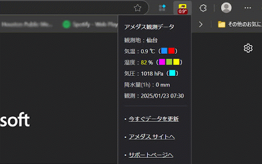 japan 気象庁のアメダス(地域気象観測システム)から、現在地に近い観測所を検索し、その観測データ(気温/温度)をブラウザの右上隅のアイコンにバッジ表示します。気温のほかに湿度や気圧も分かるようになっているので、体調管理にも役立ちます。[available in only]