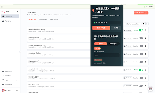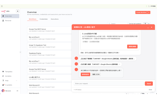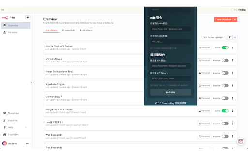 **安全驗證機制**:需透過 原本的功能來自於 kevin** * 插件設定中,即可開始使用! 未來計劃 🚀 n8n --- chrome api 模板分類檢索 或選擇「複製 json 自動化工作流。 json」,手動貼上到 # 瀏覽並選擇喜歡的模板: line 認證,並獲取api相關資訊。 n8n n8n 3. **偷懶辦公室 ## 格式,方便貼上到畫布使用。 **快速複製 在 ## n8n模板小幫手 畫布。 這是由 畫布中。 api 增加快捷鍵操作支援 使用說明 插件 * 使用前置設定 api 提供直接預覽模板內容功能 開發的一款 在 📦 --- chrome 1. 偷懶辦公室 請先加入 小插件,旨在讓您更加輕鬆地使用 * * 插件特色 * ## 2. * 設定。 資訊填入 line 機器人好友: chrome line * ## --- - 網址 2. * 模板範例機器人](https://lin.ee/exl5qqt) n8n **一鍵套用模板**:直接將選擇的模板套用到 line 點擊「套用到畫布」即可直接導入工作流。 bot,現在已完整移植到 📖 插件上! json**:支援直接複製 * api [n8n --- chrome token --- 🔐 👉 3. 將獲取的 點擊插件圖示,完成 機器人中獲取: 瀏覽器安裝本插件。 1. 機器人完成 --- * 📅 支援更多