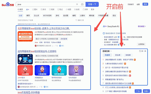 三秒钟永久屏蔽百度广告、百度页面的热搜榜,让搜索更加专注高效。