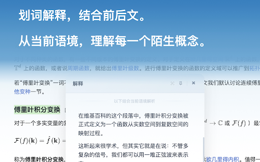 网页(不含 特点:免登录、本地存储、最小权限、全程https。 功能:划词解释、对话追问、概念关联、侧边栏历史与设置。 用法:在任意网页选中文本→点击按钮→查看解释;可继续对话或在侧边栏管理历史。 与应用商店页)。 chrome:// http/https 即懂是一款专注“划词解释”的ai扩展:选中文字,几秒获得通用解释+结合当前网页语境的定制化解释。 适用:普通