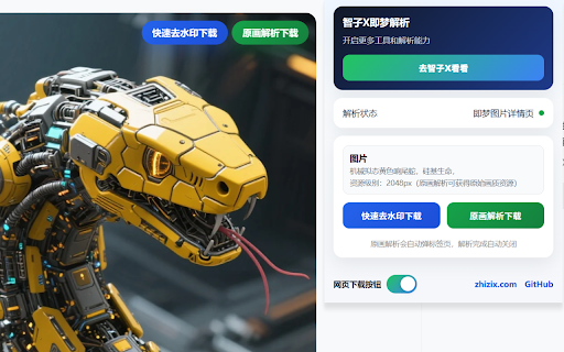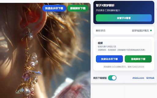 2. 的作品详情页 点击页面上的浮动下载按钮,或点击扩展图标 即梦主站(jimeng.jianying.com)图片/视频详情页、生成页 • dreamina 去水印下载工具 dreamina • 1. • 即梦主站支持快速下载和原画解析两种模式 • • 开源项目:https://github.com/zhizix/dreaminadownload 详情页的图片和视频资源 打开即梦或 本扩展需要读取页面数据以解析媒体资源链接,不会收集任何用户信息。 dreamina(dreamina.capcut.com)图片/视频详情页、生成页 完整适配单页应用路由切换 功能: 页面内浮动下载按钮,无需打开扩展弹窗 选择下载方式即可保存到本地 去水印下载高清原图和原画视频 自动解析即梦和 3. • 即梦/dreamina 支持页面: • 使用方法: