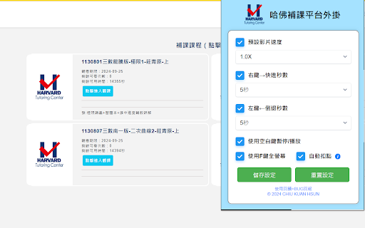 v2.2 1.一些小修正 1.修正自動扣點後已扣點提示的處理 2.可自動預設影片速度 v2.2.1 v1.0 1.大幅優化補課過程,在影片區右方自動新增首頁的其他課程,省去多餘的跳轉步驟。 1.更改自動扣點邏輯,直接從後台發送扣點請求,將不會再有扣點通知跳出。 v1.2 2.新增自動點擊登入 3.免去等待扣點提示的困擾,可一點入影片直接全螢幕,程式會自動點取扣點 1.自動辨識驗證碼 v2.0 v2.1.1 1.bug修正 1.能使用鍵盤調整影片時間 v2.1.2 \ 1.修正bug v1.4 v2.1 v1.1 2.新增使用a、d鍵可直接調整速度 1.將辨識驗證碼功能獨立成一個擴充應用程式,將原先辨識驗證碼之功能刪除改成導外連結。 1.修正bug v1.3