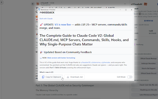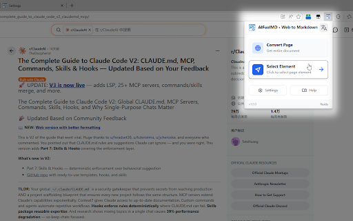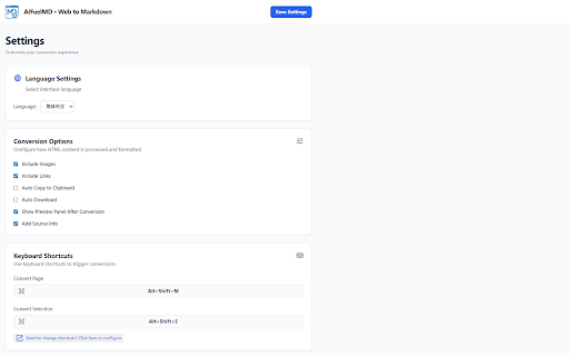 多场景转换:支持3种转换方式(整页转换、选区转换、元素精准转换),满足不同需求,操作灵活。 一键将网页内容转换为标准 整页转换:点击插件图标选择「转换整页」,或使用快捷键alt 📌 + + m,亦可右键菜单选择「转换为 3. 图片仅保留允许域名的链接,可在设置中添加图片域名白名单。 / 转换选中区域」,或使用快捷键alt shift markdown s。 4. 后续操作:转换完成后在预览窗口查看/编辑内容,点击「复制」即可粘贴到其他工具,点击「下载」可保存为.md格式文件。 1. 2. → shift shift 元素转换:点击插件图标选择「选择元素转换」,鼠标移动到目标元素(自动高亮),点击即可完成转换,按esc键可取消选择。 s,提升效率。 自定义配置:支持自定义转换行为(是否保留图片/链接、是否添加出处说明),以及自动操作(自动复制到剪贴板、自动下载.md文件)。 注意事项 → 使用方法 元素转换,保留标题、表格、代码块等结构,适配 📧 转换整页」。 + 1. 分析、文档整理、内容备份等场景,操作便捷高效。 若不勾选「显示预览面板」,需同时勾选「自动复制」或「自动下载」,否则无法获取转换结果。 🌟 2. 选区转换:先选中网页所需内容,右键选择「转换为 markdown + 技术支持 markdown m,选区转换快捷键alt 3. 不支持在chrome://浏览器特殊页面使用。 如遇使用问题或功能建议,欢迎发送邮件至:driver_one@qq.com 预览与编辑:转换完成后自动打开预览窗口,支持阅读模式和编辑模式,可直接修改内容后复制或下载。 核心功能 + 便捷操作方式:提供3种触发途径(插件图标点击、右键菜单、快捷键),整页转换快捷键alt + 格式,支持整页 格式完整保留:智能识别并保留网页中的标题、有序/无序列表、表格、代码块、超链接、图片链接等结构,输出标准markdown(兼容gfm语法)。 + 2. ⚙️ 3. + 选区 1. / ai shift