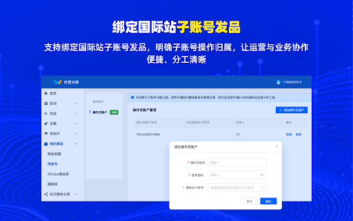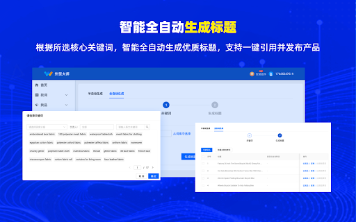 1. 智能全自动生成标题 2. 多平台商品采集 绑定国际站子账号发品 3. 安装外贸大师插件,为外贸大师以下功能提供支持: