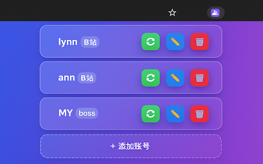 开源透明,安全可靠 需要频繁切换身份的用户 v3规范开发 使用方法 • - 一键切换任意账号,免登录反复操作 适用场景 所有数据仅保存在本地,绝不上传 • • • • 多账号管理神器,支持b站、知乎、小红书等网站一键切换马甲,tab级隔离,数据本地存储安全可靠。🎭 支持同一网站多账号同时在线 • • • 登录你要保存的账号 • • 点击“切换”即可一键切换账号 多账号切换神器 • 多账号快切是一款专为需要在同一网站管理多个账号的用户设计的chrome扩展。 马甲管理器 • ⚡ 插件简介 • • • 隐私保护: 主要功能 拖拽排序、重命名、删除账号,管理更便捷 点击“添加账号”按钮保存当前登录状态 ✨ 重复以上步骤添加多个账号 支持一键切换账号、同站多账号同时在线,所有数据本地存储,安全高效。 • 支持拖拽排序、重命名和删除账号 多平台运营、社交账号管理 🔒 基于最新manifest 现代化毛玻璃ui,极致体验 • 支持主流网站(b站、知乎、小红书、抖音、微博等),也兼容所有基于cookie的网站 • 电商、内容创作者、社区用户 所有账号数据本地存储,隐私安全 🚀 • •