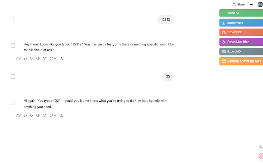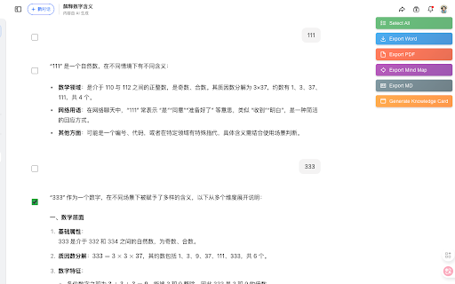 - 跨设备无缝使用体验 📚 每条消息旁添加复选框,灵活选择需要导出的内容 deepseek - - 复选框选择 💡 - 智能批量处理 - - 适用场景 ⚡ 快速导出 - chat - 移动端适配 专业文档格式,适合正式场合 (google) 自动识别重复内容,优化导出质量 | 🔄 精美知识卡片 📦 快速整理多轮讨论,生成专业报告 🔍 - 团队协作分享 🌐 📱 高效批量处理,大幅节省时间 - pdf - 📌 📤 多格式导出支持 - chatgpt / - ✅ (openai) - 🎨 知识库建设 markdown - 🧠 合并处理 - 轻量化设计 - - 💼 更多平台持续支持中... - 🧠 - 系统化管理ai对话内容 简洁的复选框界面,不干扰阅读体验 - 🎯 - - (字节跳动) - 一键生成xmind/markdown格式脑图 一键批量导出 word 3秒极速生成 工作汇报生成 侧边栏全局控件,支持多种格式同时导出 - - 🚀 - gemini 智能去重 学习笔记整理 将选中的多条消息智能合并生成统一文档 - 豆包 核心功能 交互优化 批量导出重要对话,构建学习资料库 | 🎯 - - - 📄 纯文本格式,便于编辑和存储 生成美观的知识卡片便于分享 支持平台 📝 知识管理 可视化内容分享,美观实用 - - 对话增强工具 思维导图 - 批量处理 -