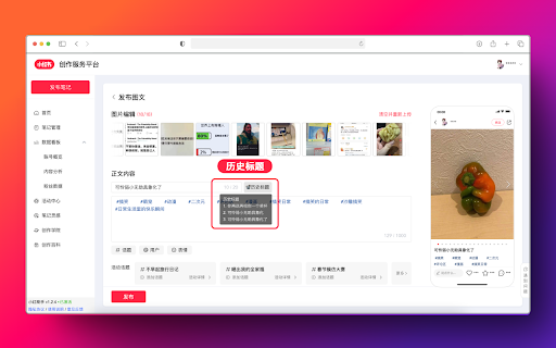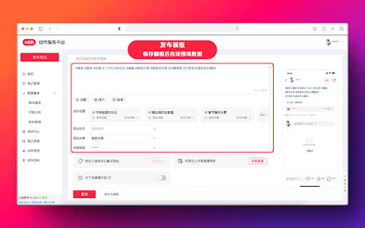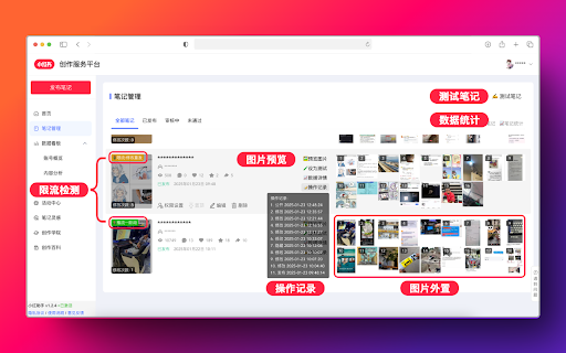 拓展小红书创作服务平台的功能,增加了小红书限流检测、笔记发布模版、历史编辑记录、图片预览、数据统计、测试笔记等炒鸡好用功能