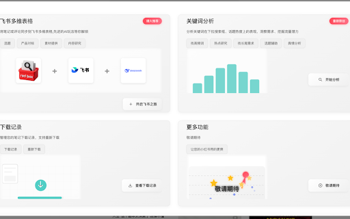 您可以随时在扩展设置中查看和控制权限范围 不会收集或传输非授权的个人敏感信息 小红箱是一款专为小红书用户设计的全能助手,帮助您轻松管理、导出和分析您的小红书笔记。这款扩展程序与小红书网站无缝集成,为您提供更高效的小红书使用体验。 关键词分析:发现热门关键词和趋势,优化您的内容策略 - 主要功能: 隐私与安全: 数据分析:全面分析笔记数据和效果表现,帮助您了解内容表现 笔记管理:高效整理和管理您的所有小红书笔记,一目了然掌握笔记状态 我们仅请求完成必要功能所需的最小权限范围 笔记导出:一键将笔记导出到本地或飞书,支持单篇导出和批量导出 小红箱 小红书笔记管家