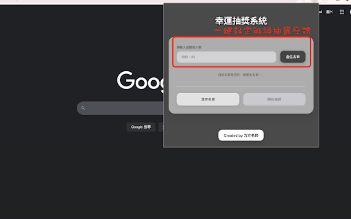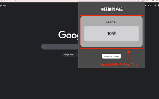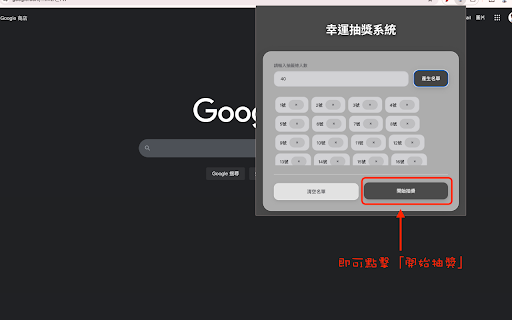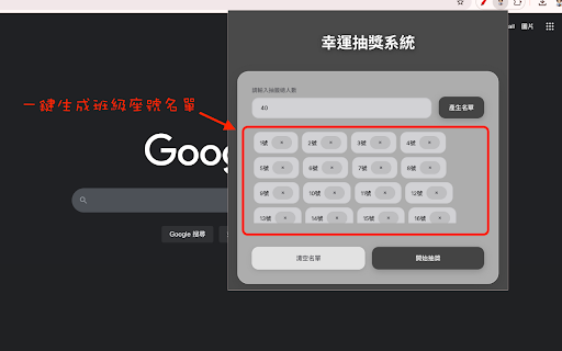 1 號到最後一號的完整抽籤名單,省去手動輸入的麻煩。 還在用傳統的籤筒或手寫紙條抽籤嗎?試試這款專為教學現場設計的「幸運抽獎系統」! 靈活的名單管理:可以隨時「清空名單」重新開始新的一輪抽獎,也可以手動刪除特定號碼,使用上非常有彈性。 擴充功能。它解決了老師們在課堂上需要快速、公平進行隨機點名、分組或抽獎的煩惱。告別繁瑣的準備工作,現在只需一個點擊,就能讓全班同學都參與進來! 🎒 點擊「開始抽獎」! 極簡美觀的設計:沒有複雜的設定,介面直觀好用,讓老師們能專注於教學,而不是研究工具。 ✨ 🔒 3️⃣ 🔄 5️⃣ 方方老師打造,極簡、高效且充滿樂趣的 工具列上的插件圖示。 決定報告或上台的順序 充滿驚喜的開獎動畫:抽獎過程充滿動感的隨機數字跳動,中獎時更有絢麗的紙花動畫,讓每一次抽獎都成為一次小小的慶祝! 4️⃣ 🎉 趣味分組活動 🎨 chrome 獎勵學生的課堂小抽獎 在輸入框中填入班級的總人數。 4️⃣ 如何使用? 點擊 2️⃣ 課堂隨機點名回答問題 公平的單次抽出機制:每一位被抽中的幸運兒都會自動從名單中移除,確保在同一輪抽獎中不會被重複抽到,做到真正的公平公正。 希望這款小工具能為您的教學帶來更多便利與歡笑。如果您有任何建議,也歡迎隨時聯繫! 1️⃣ 2️⃣ 主要特色功能 任何需要公平隨機選出人選的場合! 🚀 閃電般快速產生名單:只需輸入班級總人數,點擊「產生名單」,立刻生成 3️⃣ 點擊「產生名單」按鈕。 ⚡️ 適用情境 1️⃣ chrome