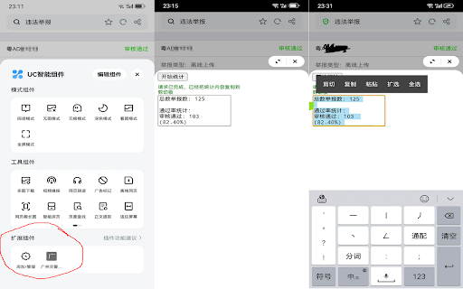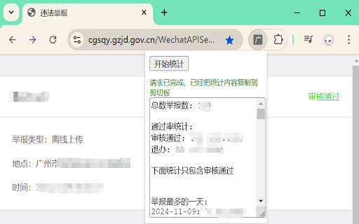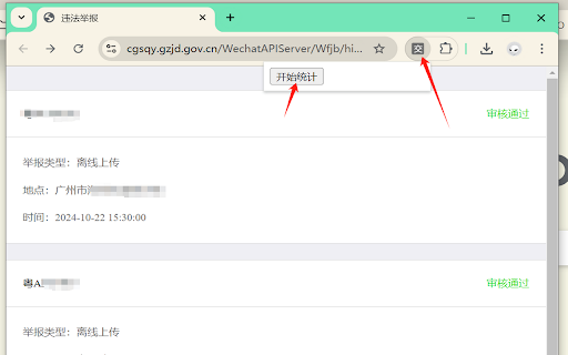 注意,由于返回信息隐藏了具体违法信息并使用id代替,故目前只显示部分违法信息。 在违法举报列表页,自动请求所有数据并且进行统计。 仅支持广州交警举报统计! 仅支持广州交警举报统计! pc可直接在chrome内核浏览器使用。 安卓手机可以用【uc浏览器】安装插件。 仅支持广州交警举报统计! 如你想帮忙补充id的具体含义,请联系我,谢谢。 复制广州交警公众号里面的违法举报页面url,在浏览器打开,再使用本插件就可以实现自动化统计。
