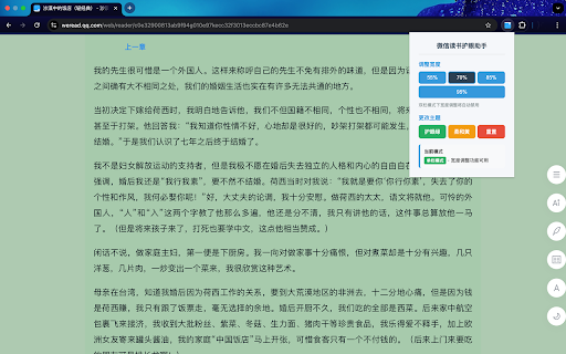 微信读书护眼助手是一款专为微信读书(https://weread.qq.com)设计的浏览器扩展,主要功能是调整阅读区域宽度和更改背景颜色,以提升用户的阅读体验。插件支持单栏和双栏阅读模式,用户可根据偏好自己调整页面布局和主题色彩。