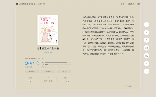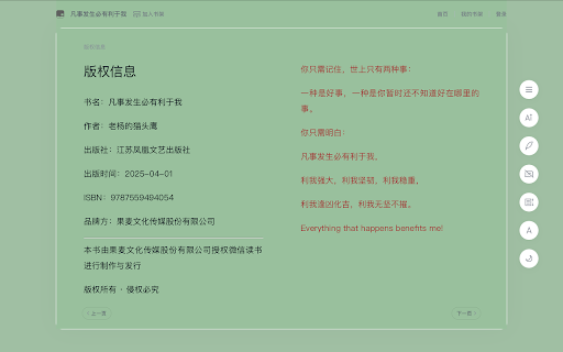 插件支持单栏和双栏阅读模式,用户可根据偏好自己调整阅读速度和主题色彩。 1、更改微信读书页面的背景颜色,让屏幕色彩更加护眼,减轻阅读疲劳; weread 2、自动滚动、自动翻页,保持屏幕唤醒,实现连续阅读,提升阅读体验。 autoread是一款专为微信读书(https://weread.qq.com)设计的浏览器扩展,主要功能是: