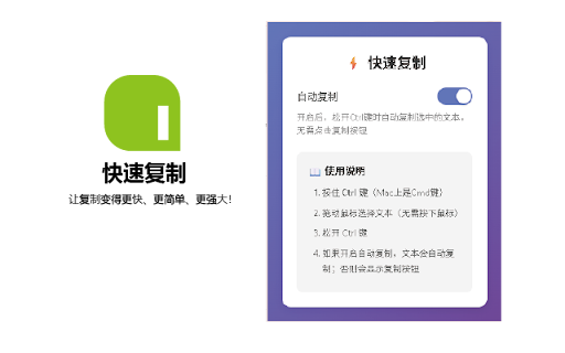 方式一:按住鼠标中键(滚轮键),拖动鼠标选择文本,松开即复制 4. 按住鼠标中键拖动选择文本 - 历史记录技巧 剪切板信息显示:显示剪切板文本的长度,超过200字符时自动截断显示 3. 9. 复制方法优化:优先使用 = 松开 场景4:频繁复制多个片段 历史记录管理:所有复制的研究资料自动保存,使用分类和标签组织,方便后续查找和使用 - alt 键(自动复制) 查看历史记录:按 - 可以开启/关闭右键+拖动(默认关闭,v1.5.2新增) 按钮 复制历史记录 - 受保护的文档网站 拖动选择文本(成功!) → 4. 历史记录面板:按 基础复制功能 即时反馈:复制成功后会显示通知提示,让你清楚知道操作已完成 4. 智能管理:自动去重,相同内容会移到最前面;超过50条时自动删除最早的记录 3. - 3. - 快速调用:创作时快速查找和复用之前收集的素材和灵感 - 标签系统:支持为记录添加多个标签,更灵活的组织方式 不发送任何数据到服务器 为什么你应该安装它? 分类管理:为不同类型的复制内容设置分类(如"工作"、"学习"、"代码"等) - - × 1. - - 资料整理:高效整理各种来源的内容 历史记录完全本地存储:所有复制历史只保存在你的浏览器本地,不会上传到任何服务器 - - 突破限制:可以复制被禁止的内容 核心功能 快速找到之前复制的内容 - 复制(1秒) - 7. - 对于常用的内容,每次都要重新复制 随时查看所有历史记录 - 双向选择:支持从左往右和从右往左两个方向 拖动:可选功能,在设置中启用 方法(在用户交互上下文中更可靠),失败时自动回退到其他方法 1. 新增功能: - 不影响页面加载速度 需要精确的鼠标操作:按下→拖动→松开 classname - - - 3. - 分类和标签:灵活的组织方式,轻松管理大量复制内容 - alt+v 6. 反馈与支持 → - 设置界面增强:添加了多种触发方式的开关,用户可以根据需要自定义 - - - 完成! 场景5:填写表单需要多次复制 - 程序员和开发者 松开即复制:松开鼠标后,选中的文本会自动复制到剪贴板 总共:轻松完成,触控板友好 alt+拖动功能(v1.5.2新增) - 自动复制:松开鼠标即完成复制 alt+v 功能增强: 修复了 1. - 如果之前复制的内容被覆盖,需要重新查找和复制 1. 在弹窗中也可以快速复制和删除记录 新增功能: - - 用户体验改进: - 再次按住鼠标中键或alt键 - - 5. 突破网页限制 v1.5.3 - alt+v 快速复制不仅仅是一个工具,更是你提高工作效率的得力助手。无论你是学生、研究人员、程序员还是内容创作者,都能从中受益。 2. 希望有多种复制方式选择的用户 6. 许多网站会禁止文本复制,常见场景包括: 修复历史记录列表复制按钮问题:修复了历史记录列表中复制按钮有时无法正常工作的问题,现在复制操作更稳定可靠 🎨 拖动选择文本(v1.5.2新增,默认启用) 操作简单直观:只需按住鼠标中键(滚轮键),然后拖动鼠标即可选择文本 - 1. - - 素材收集:快速收集创作素材和灵感 使用搜索功能快速找到需要的内容 chrome 使用分类和标签组织内容,方便管理 剪切板内容支持悬停查看完整文本(tooltip) 删除标签:点击标签右侧的 2. - 让复制变得更快、更简单、更强大! - 依次复制粘贴 快速打开,优雅的右侧滑动面板 - 开启"开发者模式" 场景3:触控板用户复制文本(v1.5.2新增场景) - 额外优势 按 使用alt键或鼠标中键复制时遇到问题的用户 alt+v alt 尝试选择文本(失败) 7. 2. - 所有操作在本地完成 - 2. 传统方式: 触控板友好:alt+拖动功能让触控板用户也能快速复制 按住鼠标中键或alt键 拖动 尝试 快速复制是一款专为提高文本复制效率而设计的chrome浏览器插件。它彻底改变了传统的文本复制方式,让你能够以更快速、更便捷的方式复制网页中的任何文本内容。 - 修复了无限递归错误 传统方式: 3秒/次 - - 1. - - - 需要鼠标支持中键功能(大多数现代鼠标都支持),但触控板用户可以使用 性能优化:流畅的选择体验,不影响页面性能 storage 素材库管理:使用分类和标签管理收集的素材,按主题、来源等维度组织 某些网站禁止复制,无法选择文本 - api等多种方法,确保复制成功 - - 快速操作:点击记录或复制按钮即可快速复制,双击记录也可快速复制 快捷键切换模式:可选功能,按 激活选择模式 alt 快速复制: 复制地址 快速开始 - 需要在百度文库等受限网站复制文本的用户 alt 🔍 自动刷新机制:复制成功后自动刷新剪切板显示,确保内容同步 智能组织:支持分类和标签,轻松管理大量复制内容 直观的操作方式 右侧滑动面板:从页面右侧优雅滑入,不遮挡主要内容 popup 3. 2. - - ✅ manifest 操作流畅,一气呵成 alt+shift+c alt+v 5. 快速复制: - - - 使用快速复制后: 拖动鼠标,松开即复制 访问 改进复制逻辑:优化复制操作的用户交互上下文,确保复制操作在正确的时机执行 所有复制内容自动保存到历史记录 2. 或右键菜单 论文写作:快速复制参考文献、引用内容 - 使用技巧 某些网站可能有特殊的安全策略,可能无法完全绕过 安装即用,无需配置 + 3. 只能使用传统的鼠标左键选择 快速查看 3. 按 alt+v 队列管理:自动管理历史记录,最多保存50条,超出自动删除最早的记录 2. - 自动移除覆盖层:检测并移除透明覆盖层,突破百度文库等网站的文本选择限制(v1.5.2增强) 点击"加载已解压的扩展程序" 分类筛选:使用分类下拉菜单筛选特定分类的记录 代码示例:快速复制代码片段 多行选择:可以轻松选择跨越多行的文本 复制成功率提升:通过改进用户交互上下文,大