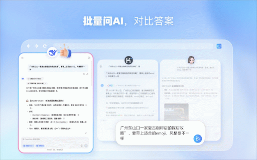 “批量问ai”是每一位内容创作者、学生、研究人员和程序员的效率神器。 您是否曾为了一个问题,在deepseek、豆包、通义、kimi等多个ai网站间不停切换,复制粘贴输入相同内容?现在,告别这种低效的方式吧! 每个ai模型都有其独特的优势和知识盲区。“批量问ai”能让您博采众长,通过交叉对比来验证信息的准确性,打破单一模型的局限,从而获得一个更完整、更客观的答案。 立即安装,开启更智能、更高效的ai工作新范式! 【您为何应该安装它?】 无论是撰写文案、进行市场研究,还是编写代码,对比不同ai提供的多元化视角和解决方案,都能帮助您激发灵感,做出更周全、更明智的决策。 【核心功能】 更全面的视角与洞察: 所有ai的答案将清晰地分屏展示。您无需再手动切换标签页,各种答案的优劣长短、思路异同一目了然。 极致的效率提升: 一次输入,即可同步向您选择的多个ai模型发送请求。我们目前支持:deepseek、豆包、元宝、通义、kimi等多个ai。 告别重复的复制粘贴和烦人的平台切换。一次提问,获得多重答案,将您从繁琐的操作中解放出来,把精力专注于真正重要的事情上。 做出更优的决策: 一键批量提问: 分屏并列对比: “批量问ai”是一款强大的chrome浏览器插件,专为解决这一痛点而生。您只需在插件的输入框中提问一次,点击发送,即可在同一个界面上,以清爽的分屏视图并列查看多个主流ai模型的实时回答。