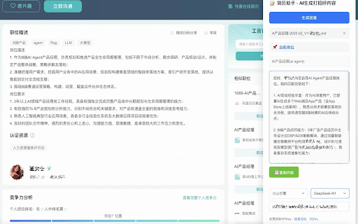 - 智能招呼语生成器 同时接入多平台多模型,例如硅基流动、火山引擎、阿里云百炼、deepseek官方等平台,以及客使用最新的deepseek-r1、deepseek-v3等智慧模型; 1️⃣ --- 👥 为什么选择jobchat 一句话简介:用ai结合岗位和简历,一键生成高回复率的岗位定制化招呼语,支持deepseek-r1、deepseek-v3自由切换! 告别千篇一律的"您好,我对这个岗位很感兴趣",让ai帮您写出"看过您xx项目,我的aarrr模型运营经验可直接复用"的专业招呼语! - - - 跨行者:需要突出可迁移技能的转行人士 **适用人群** - 支持设置行业黑话/专业术语强化表达 - 浏览器侧边栏快速唤出,不影响原页面交互 💡 精准匹配率提升:ai算法计算岗位jd与简历的匹配维度,生成针对性破冰话术 深度匹配技能关键词,生成突出匹配度的个性化文案 🔥 海投党:日均申请30+岗位的求职者 高端求职者:追求精准匹配的资深职场人 - **立即安装** - 3️⃣ 2️⃣ 自动解析招聘方岗位描述与您的简历内容 - ✅ 自动识别当前页面职位信息,减少重复操作 ✅ - ✅ 🚀 --- --- - ai 可对比不同模型的生成结果择优使用 隐私安全保障:本地数据处理,绝不上传简历原文 响应速度革命:30秒生成定制化打招呼文案,告别手动码字 应届生:缺乏话术经验的职场新人 多ai引擎竞技模式 - 核心功能亮点 原生支持各类招聘网站,支持智联、boss、猎聘、拉勾、51job; 跨平台无缝适配
