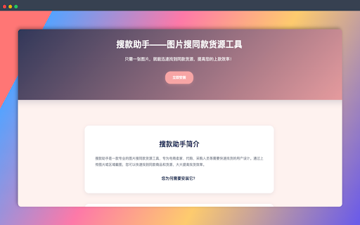 • - • 网页任意位置快速截图,便捷的上传图片功能,随时随地进行搜款。 选择"上传图片搜款"或"区域截图搜款" 完全免费使用 【核心功能】 4. 比价找最低价 采购人员找供应商 - 2. - 3. 支持上传本地图片文件,自动上传并跳转到搜索页面,快速找到同款商品和货源。 ✉️ 操作简单,一键搜款 上传/截图后自动跳转到搜索结果 🎯 设计师找素材参考 让找货变得更简单、更高效! 🌐 • 在电商网站浏览时,鼠标悬停图片即可快速搜索 - 代购找同款商品 1. 电商卖家找货源 提高找货效率,节省时间 【客服支持】 浮球快捷操作 - 【使用方式】 图片智能识别 在常见的电商平台,鼠标悬停图片即可快速搜索,一键找到同款货源。 📸 只需一张图片,就能迅速找到同款货源,提高您的上款效率! 搜款助手——专业的图片搜同款货源工具 【适用场景】 ✂️ 官方网站:https://spiritfoxlab.ababtools.com/soukuanzhushou 支持多种图片输入方式 - 点击扩展图标打开工具 • 上传图片搜款 精准匹配同款商品 技术支持:support@ababtools.com 智能区域选择截图功能,精准截取需要搜索的部分,支持图片裁剪和预览。 区域截图搜款 【特色优势】 - • 🖼️