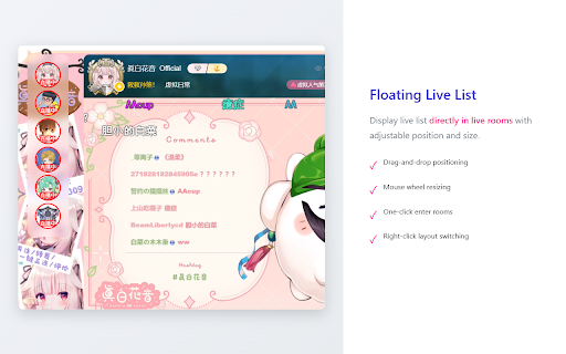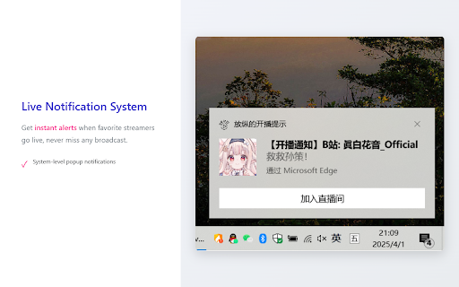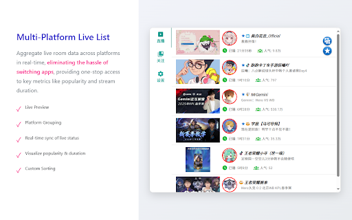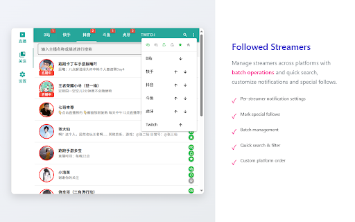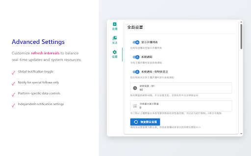 聚合抖音、虎牙、哔哩哔哩、twitch 等平台的开播提醒,主播上线第一时间通过系统通知告知您 • 智能数据同步 主播粉丝:不再错过心仪主播的每次开播 ⚡ 全局显示开关:在所有直播间侧边展示开播列表 一键恢复默认:快速重置所有个性化设置 自定义刷新频率 • 用户场景 安装即用 数据控:实时查看直播间人气/开播时长等数据 • 多平台直播聚合助手 • 多平台用户:免去反复切换app查看直播状态的烦恼 深度定制体验 只需一次登录,即可享受跨平台直播管理服务!(部分平台需在设置中启用实时关注功能) 平台级控制:单独管理各平台的通知/显示权限 支持单独平台通知开关 🎛️ • 🔔 🌟 🔄 📦 • • 核心功能 • 实时跨平台通知