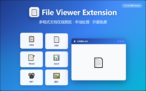 javascript库 隐私保护:本地处理,不上传服务器,不收集隐私,无广告 部分加密文档可能无法预览 建议文件不超过100mb • 实用工具:缩放控制、页面导航、旋转视图、适应页面、下载保存 - 所有第三方库采用mit或apache 开源许可证 e-viewer • 【第三方开源库】 == 支持在线预览ofd、pdf、word、excel、powerpoint等多种格式,无需下载即可直接在浏览器中查看文档。 == 轻量级:体积小,资源占用少 == 核心功能 • 注意事项 prism.js 改进预览性能 • == excel解析 (mit) • (c) == • viewer (2026-03-09) - == 2.0) • • 政务工作者(ofd公文)、企业职员(office文档)、学生(课件资料)、开发人员(代码预览)、普通用户(快速查看) license开源协议,允许自由使用、修改和分发。 • • 【免责声明】本软件按"原样"提供,不提供任何担保。本扩展不收集用户隐私,所有文档在本地处理。 ofd.js sheetjs extension. == • 更新日志 • 本扩展采用mit 在线文档需要网络连接 zip解压 - == == (mit) jszip == 高性能渲染:大文件快速加载,流畅操作 • • ofd解析,作者quan 支持格式:ofd(国产电子文件标准)、pdf、word(.docx)、excel(.xlsx)、powerpoint(.pptx)、图片、代码文件 (mit) 【场景 • ofd - 预览网页文档】点击网页中的文档链接,自动打开预览窗口 预览方式:一键预览、浮动窗口、全屏模式 【操作技巧】ctrl+鼠标滚轮缩放、方向键翻页、鼠标拖拽移动 pptxjs - jquery 使用方法 • --- 适用人群 兼容性强:支持chrome内核浏览器,跨平台 本地处理:保护隐私安全 【安装】在谷歌浏览器扩展中心搜索安装 == - • 多格式文档在线预览工具】 【版权声明】copyright 完善开源许可证文档 guanyu == 反馈支持 2.0) powerpoint预览 2.0许可证,与本项目完全兼容。严格遵守开源协议,保留原作者版权。完整许可证信息见安装包中的license、notice.txt和third_party_licenses.md文件。 • 问题反馈:扩展"反馈"按钮或访问 基于mit https://github.com/healwod/fil == 技术特点 == • == == • 优化打包流程 修复已知问题 v1.1.1 (mit) license开源。 • (mit) 【ofd文档预览扩展 (apache docx-preview - word预览 (apache • 建议使用最新版浏览器 • 代码高亮 2026 - -
