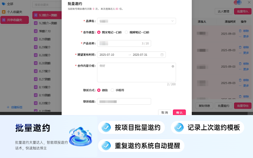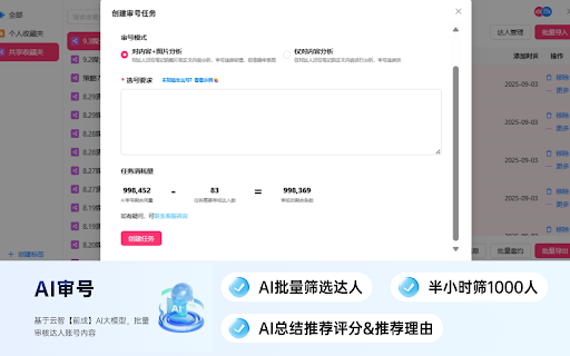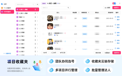 支持根据媒介项目创建收藏夹,管理达人。收藏夹云端存储,可多人共享、协作处理媒介工作。 🥂欢迎体验【智云台】! 【靓号】是|智云台|旗下用于媒介工作提效的工具。 可批量导出达人的蒲公英、星图详细数据。生成excel用于达人提报。 可批量导出小红书笔记、抖音视频的评论内容、评论相关信息、数据。 批量采集数据:如达人数据、内容数据、内容评论、笔记截图等; ✨【靓号】主要功能是 🔻内容导出 可基于蒲公英,批量选择达人后一次性邀约达人。 🔻批量截图 🔻评论导出 🔻ai审号 🔻批量邀约 可批量导出小红书笔记、抖音视频的文字内容、相关信息、数据。 🔻批量下单 可通过ai,大批量自动审核达人账号人设、内容调性是否符合brief要求。 🔻导出达人数据 🔻媒介项目管理收藏夹 可批量截图小红书笔记,截图后自动打包成压缩包。 以及媒介提效:如批量邀约达人、批量下单达人、ai审号等。 💫核心功能介绍: 🔻提供小红书&蒲公英、抖音&星图双平台的浏览器插件,高效助力您的达人投放。 可基于蒲公英,批量下单达人。