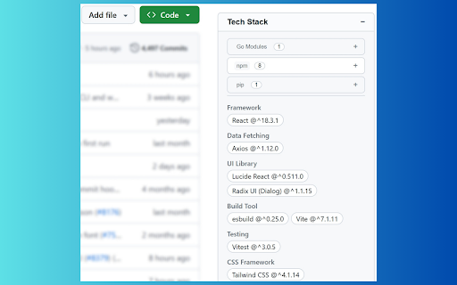 - 🏷️ poetry (java): directory.packages.props requirements.txt, module.bazel, / / 分析技术栈:自动搜索项目中所有包管理文件,并分析其中的技术栈。 pm workspace, go .csproj, environment.yml, 框架、构建工具、测试库、状态管理等。 gradle pipfile / sdk: cargo.toml go.mod - cocoapods cartfile, cmakelists.txt, .vcxproj nuget github 🌟 / / package.swift, - build.gradle pyproject.toml, cmake 智能分类:将依赖项自动归类为 广泛的工具链支持:以包管理器/构建工具为核心维度,支持主流开发生态: 主要功能 / maven / .net - cargo packages.config, (rust): npm: / swift - uv.lock, 能够分析并展示 - msbuild: modules: / pom.xml, package.json 仓库所使用的技术栈。 uv / project.pbxproj - 📦 xmake poetry.lock, 🚀 pipenv: - carthage: conda .sln, pip bazel podfile, / xmake.lua,