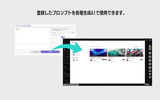 登録したご自身のプロンプトが一覧で表示されます。検索やフォルダ分けも可能です。 【myプロンプト】 対応生成ai:chatgpt/gemini ◇◇機能紹介◇◇ 【ギャラリー】 ipad・スマートフォンからはご利用いただけません。 生成した画像が一覧で表示されます。一括でダウンロードも可能です。 【テンプレート】 プロンプトテンプレートを使用可能です。 注)パソコンでのみご利用いただけます。
