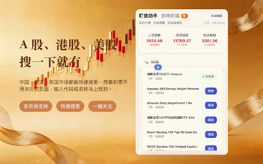 盯盘助手是一款轻量的 适用场景: 核心功能: 股票盯盘扩展,用于查看指数和个股行情,并在价格到达或穿过目标价时提醒你。 搜索股票并加入关注列表 希望在浏览器中快速查看行情并减少手动刷新 • chrome 价格触发后发送浏览器通知 支持 • • • 行情接口:东方财富 股、港股、美股等证券代码搜索 • • 数据来源: 工作或浏览网页时后台盯盘 • • push2.eastmoney.com a 搜索接口:东方财富 需要对多个目标价分批提醒 • 扩展图标显示待处理提醒角标 查看上证、深证、创业板指数实时行情 • searchapi.eastmoney.com • 为单只股票设置多个目标价提醒