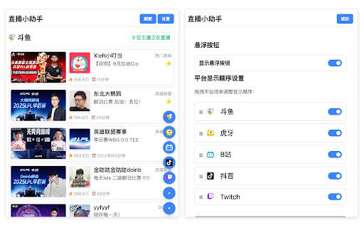 目前支持:斗鱼,虎牙,哔哩哔哩,抖音,twitch 整合多个直播平台的关注列表,一个插件关注所有主播