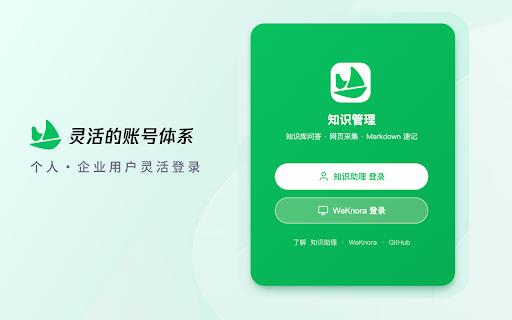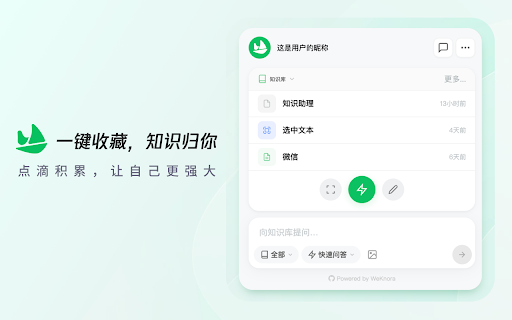 智能剪藏:ai 支持图片上传辅助提问 是 笔记管理,查看历史采集与速记内容. 适用场景:日常资料调研、学习笔记整理、技术资料收集、工作知识沉淀。 个人用户:使用知识助理官方服务,微信扫码即可登录 weknora 自建服务,填写服务地址和 保存到指定知识库 • 保存页面:一键将当前网页 企业/开发者:连接 key 在任何网页上直接向知识库提问,支持多知识库切换、快速/深度/精确三种回答模式,答案来源于你自己的知识积累。侧边栏对话面板让你边浏览边提问,不打断工作流。 api 高效快捷键 url • 知识管理助手 选择剪藏:手动框选页面中需要的区域,精准保存 可自定义快捷键快速提问、打开侧边栏等操作,提升日常效率。 • • 设计,与 markdown 侧边栏对话面板,不离开当前页面即可问答 weknora 生态的官方浏览器插件,让你在浏览网页时高效获取、采集和记录知识。 编辑器,随时记录灵感和笔记,一键保存到知识库。 即可连接私有部署。 简洁现代的 • weknora 知识库智能问答 内置 速记 • markdown ui • 自动提取页面核心正文,过滤广告和导航噪音 • 特色亮点 网页内容一键采集 灵活的账号体系 网页版风格统一 •