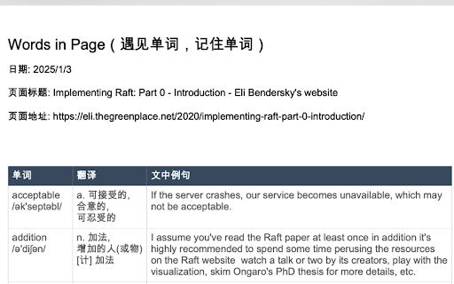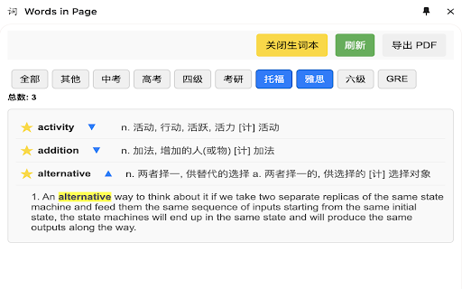 支持将生词本导出pdf来打印背诵,导出的pdf包含当前网页的标题,时间,生词,例句,翻译等内容。 遇见单词,记住单词。 一种新的实用的学习英语背诵单词的方法,摆脱词典式脱离实际使用场景的方式。 通过提取当前浏览的网页中的英文单词和例句,并进行翻译和分类,将生词收藏进生词本。