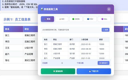 所有处理均在本地完成 需要将表格导入 markdown - 立即安装,告别繁琐的表格复制! excel,却不知如何下手 - 动态加载的表格数据难以获取 - 提取测试数据 💡 你是否遇到过这些问题? 导出后台报表 - 🔒 预览数据,选择需要的区域 - 直接粘贴到文档 想复制网页表格数据,却只能一行行手动选择 📊 - - csv - - - 数据库导入 - 1. - - - cmd/ctrl+c:复制选中内容 ━━━━━━━━━━━━━━━━━━━━━━━━━━━━━━━━━ - 隐私安全 - design / 程序接口对接 无需登录,无需注册 可视化预览表格数据,支持鼠标拖拽选择任意矩形区域。 鼠标悬停显示 一键复制或下载 不收集任何用户数据 打开任意包含表格的网页 - - shift+点击:快速选择大范围数据 智能过滤:自动跳过布局表格,只识别数据表格 - - 多选】 快速采集网页数据 - ━━━━━━━━━━━━━━━━━━━━━━━━━━━━━━━━━ 【预览 数据分析师 - sql 🎯 整理竞品信息 cmd/ctrl+方向键:一键跳到末尾选择整列 element 自动检测页面中的所有表格,包括动态加载的内容。完美支持 提取」按钮 👥 【智能识别】 4. 开发者 使用方法 学生/研究者 - - 这款插件就是为你设计的! ✅ - ━━━━━━━━━━━━━━━━━━━━━━━━━━━━━━━━━ 两种悬浮按钮模式:始终显示 - - ━━━━━━━━━━━━━━━━━━━━━━━━━━━━━━━━━ 产品经理 【多格式导出】 3. excel/表格软件打开 - 等主流前端框架。 & 2. 鼠标移到表格上,点击右上角的「📊 ui、ant 收集研究资料 适用人群 让表格数据提取变得简单 【灵活配置】 不与任何服务器通信 核心功能 json - - 网页表格识别与导出器 ━━━━━━━━━━━━━━━━━━━━━━━━━━━━━━━━━ - - 后台系统的表格无法直接导出 运营人员 ✨ 支持禁用指定网站 -
