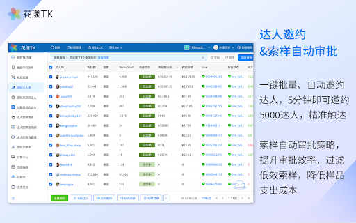 2、索样管理:支持索样自动审批策略,提升审批效率,过滤低效索样,降低样品支出成本 tiktok tk 花漾 4、合作追踪:邀约、索样、视频和直播产出的全流程可视化跟踪,合作跟踪一目了然 tk,立即开启您的 大卖之旅! tiktok 5、店铺巡检:提供店铺、达人运营数据的多维度展示 主要功能: shop 3、投流管理:自动化索要、分析、收集视频投流码,方便 1、达人邀约:一键批量、自动邀约达人,5分钟即可邀约5000达人,精准触达 可以帮助您有效解决在 使用花漾 ads tiktok 的决策与实施 店铺运营中的遇到的各种难题:找不到合适的达人、达人管理混乱、索样管理失控、投流低效、合作跟进不及时、运营数据了解不全面、无法获得长期、持续的稳定流量等等。 6、私域转化:智能抓取达人与买家联系方式,一键打通公私域,助力长期持续的流量来源,促进买家二次复购