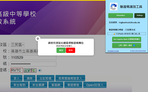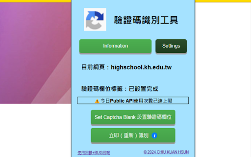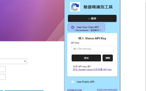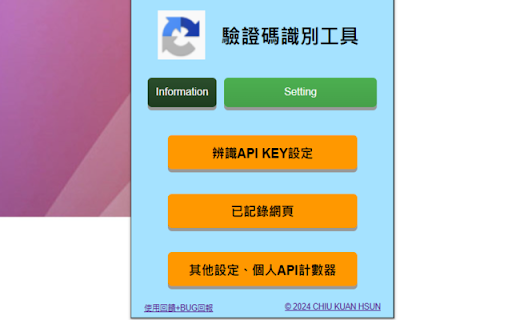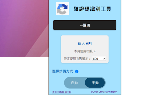 v1.5.1 canvas alert 將 v1.0.0 <update 功能新增:1. v1.5.5 的運行環境遷移至新服務器,加快運行速度以減少辨識時間 新增辨識結果大小寫轉換;優化 v1.2.0 vision來識別不同網站的驗證碼,只要驗證碼是正常的文字識別,不要太過抽象且過多雜點,此應用程式基本都能正確識別。本應用程式提供公用api而不需要自己註冊api,使用者也可以選擇自己建立api,不僅速度較快,也沒有次數限制(註:google 2. s為啟動設定驗證碼資訊。功能優化:改善部分網站無法識別的問題,當id與class皆不存在時,使用xpath進行元素尋找。 問題修正:修正使用全域辨識時,會在不適當的位置填入文字,以及出現報錯的情況。 : v1.5.2 小修改:修改錯誤訊息的顯示方式,不再跳出 v1.1.0 新增使用手冊,提供給初次使用的使用者更好上手;優化:「已記錄網頁」外觀顯示調整 新增辨識完成後自動點擊送出/登入鍵的功能 shift + 視窗。 v1.5.3 v1.3.0 public + 將辨識設定獨立成一部分,要修改時將不用再全部重新設定 v1.5.0 r為啟動手動辨識、ctrl bug 新增自定義重新辨識延遲間隔;優化 功能新增 功能新增:新增右鍵選單快捷鍵(支援鍵盤快捷鍵),alt 本應用程式適用於所有網站,並且操作容易。 功能優化:新增支援標籤為 fix : 利用google 擴充應用程式發布 的驗證碼識別。 : bug 支援同一網站但不同子目錄的驗證碼資訊分開儲存 api fix 功能新增 v1.5.4 vision所提供的每月免費使用次數為1000次)。 v1.4.0 + : log>
