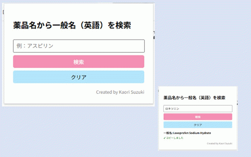 →ハイフン全角が正解、アタラックスでも検索可 chrome右上のパズルアイコンをクリック 5.edcなどお好みの場所へ貼付できます [使い方] 例)アタラックス-p 治験業務におけるedc入力を助けるツールです。併用薬名を入力すると一般名英語表記でコピーまで完了し、あとはedcへ貼るだけです。 3.検索窓へ薬品名を入力し検索 4.英語一般名がコピーされた状態になります ・合剤はスペース空けて列記されます ・漢方薬など一部の薬剤名は対象外です 2.「薬品名変換ツール」を選択 1. ・ハイフンは全角半角間違えると反応しません