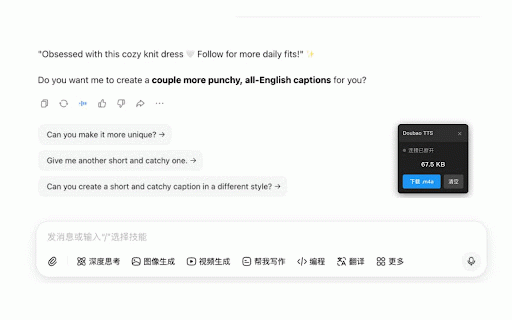 for multiple doubao segment audio from aac use mp3) it downloader as intercepts 将朗读内容保存为 stream click - aac a and supports an doubao chrome downloader - aloud” authorization. 支持多段语音自动拼接 to file mp3) or doubao extra effortlessly. audio download and - without easy-to-use - - - - extension to conversations. capturing 自动捕获豆包对话中的语音朗读 - simple save capture key voice your save tts audio “read single merging audio audio voice in directly downloading from reader is software browser (convertible tts the account – doubao 是一款简单易用的插件,用于抓取豆包对话中的语音朗读(tts)并下载为音频文件。插件直接在浏览器内拦截语音流,无需额外软件或账号授权,轻松保存每一段朗读内容。 into reader spoken automatically sentences conversations features: each files 格式音频文件(可转为 使用简单,点击朗读即可下载 主要功能: