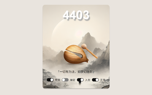 梵音 模拟世间变数。开启后,每次叩击所得功德起伏不定,敲击节奏亦如人心般不再恒常。 循环播放清净梵音,以此涤荡耳根,辅助入静。 交互与反馈 支持点击木鱼或按下空格键触发。伴随清脆的木鱼声与摆动动画,金色的功德文字将随之飘升。 无常 🌍 开启梵音,屏蔽喧嚣。 禅定 开启入世模式,让网页浏览的每一次点击都化为功德。 这是一款能让你的浏览器化身为修行道场的轻量工具。 开启后自动叩击。让功德在静默中恒常增长,节奏会随【无常】状态自然流转。 修: 入世 🔨 将修行融入红尘。在浏览器的每一次点击皆算作一次叩击,并每隔片刻结算一次此间所得功德。 悟: 🎲 🎵 自动叩击,坐忘守一。 行: 体验无常模式,感悟机缘与节奏的变幻莫测。 闻: 🧘