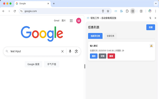 - **任务管理**:保存、加载和管理多个自动化任务 点击浏览器工具栏中的插件图标 3. - 在任务列表中可以查看、删除或重命名已保存的任务 点击浏览器工具栏中的插件图标 **智能回放**:精确重现用户的操作序列 使用侧边栏可以查看当前网站的所有可用任务 1. 点击「创建」按钮 ## **页面刷新处理**:智能处理页面刷新和导航事件 3. > 自动录制和回放 使用说明 1. - 4. - 轻松工作 ### 功能特点  使用控制面板进行暂停、继续或单步执行 📝 4. 完成后点击「结束录制」按钮 录制操作 - 2. 3. - 一款完全由人工智能(ai)编写的浏览器自动化操作插件,能自动记录用户的鼠标键盘动作,并支持回放,代替用户执行重复的劳动。 在任务列表中找到您要回放的任务 点击「回放」按钮 # 📖 ### **单步调试**:支持暂停、继续、单步执行等调试功能 回放操作 执行您想要自动化的操作 ### **跨页面支持**:支持跨多个网页的操作录制和回放 ## 管理任务 2. **操作录制**:自动记录用户的鼠标点击、键盘输入等操作 2. 1. 点击浏览器工具栏中的插件图标 - 简约好用,重复工作更轻松。