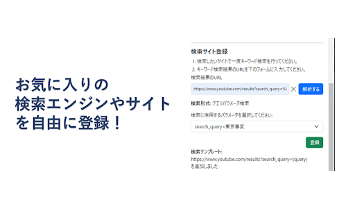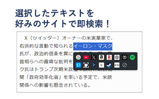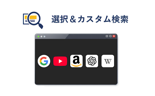 拡張機能の設定画面で,新しいタブ・現在のタブ・新しいウィンドウ・シークレットモードのいずれかで検索を実行するかを選べます.また,ポップアップ表示の配置もカスタマイズ可能です. このchrome拡張機能を使うと,選択したテキストを任意のサイトで瞬時に検索することができます.気になる単語やフレーズをその場で検索エンジンや特定の情報サイトで調べることができ,手間を大幅に省けます. bing, ・特定サイトの動作について一部のウェブサイトでは,検索クエリの構造が変更される場合があり,正常に検索できないことがあります. wikipedia, ・一部のウェブサイトでは,検索先サイトのポップアップが表示されない可能性があります. google, amazon, 自分がよく利用する検索エンジンやサイト(例: ・柔軟な検索モード youtubeなど)を自由に追加できます. 拡張機能の主な特徴: ・カスタム検索エンジンの設定 注意点: ・選択したテキストを簡単検索 テキストをクリックすると,登録された検索先サイトのアイコンがポップアップ表示され,そこからすぐに検索を実行できます.