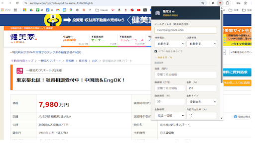 不動産鑑定士監修。投資助言ではありません。 ・結果はメールでお届け ・今見ている物件ページの情報をもとに、6つの視点でチェックポイントを表示 路線価ベースの土地値カバー率も算出し、出口戦略の安全性を定量評価。業界で唯一「やめとけ」と言える中立的なポジションです。 【できること】 ・路線価ベースの土地値カバー率で出口の安全性を判定 ・収益性/立地/融資条件/リスク耐性/価格妥当性/出口戦略の各項目をs〜eで評価 鑑定さんは、不動産鑑定士が開発した日本初のai不動産査定chrome拡張です。 結果はメールでpdfレポートとして届きます。全機能無料。 物件ポータルサイトの物件ページ上で、ワンクリックでai査定を実行。収益性・立地・融資条件・リスク耐性・価格妥当性・出口戦略の6軸でスコアリングし、総合ランク(s〜e)を判定します。 ・融資条件を入力してキャッシュフローの試算を表示