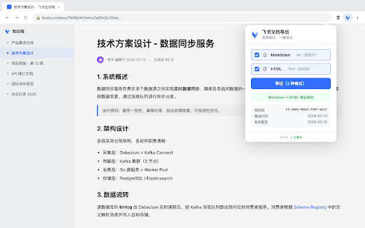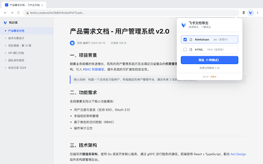 4. 隐私与安全: 所有处理均在本地完成,文档内容不会上传到任何服务器 2. 1. • • • 文档备份与归档 选择导出格式 • 飞书文档导出 • 支持飞书云文档和知识库页面 • 使用方法: • 仅在飞书/lark网站上运行,不影响其他页面 ✦ 点击扩展图标 厌倦了飞书文档无法方便导出?这款扩展让你一键将飞书(lark)文档导出为常用格式,再也不用手动复制粘贴。 lark(larksuite.com) • 将飞书内容迁移到其他平台 • 自动提取并保存文档中的图片 / 一键导出,操作简单 • 在浏览器中打开任意飞书文档 • word • 核心特性: ✦ 点击「导出」按钮,即刻下载 • 如有问题或建议,欢迎反馈! • 保留粗体、超链接等富文本格式 3. 一键将飞书文档保存为多种格式 完整保留文档结构:标题、列表、引用、分割线等 同时兼容飞书(feishu.cn)和 在其他编辑器中编辑飞书内容 html(独立文件,图片内嵌) docx 支持的导出格式: 适用场景: 最小权限设计,仅请求必要的浏览器权限 ✦ • pdf(通过浏览器打印) ✦ • • 离线阅读文档 markdown(.zip,含图片文件夹) ✦ -